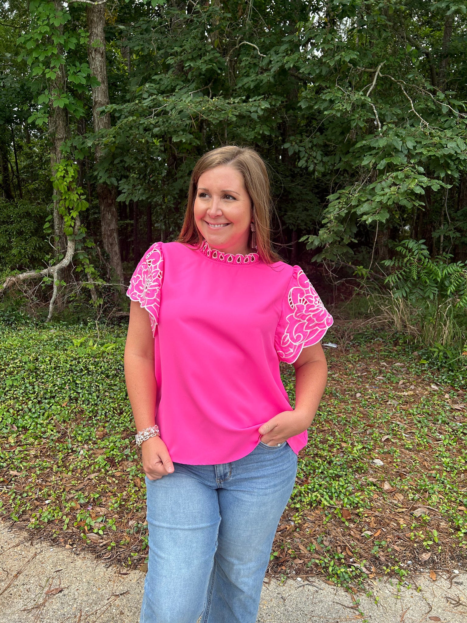 B40147 Ruffle Sleeve Top Featuring Embroidered Details on Sleeve