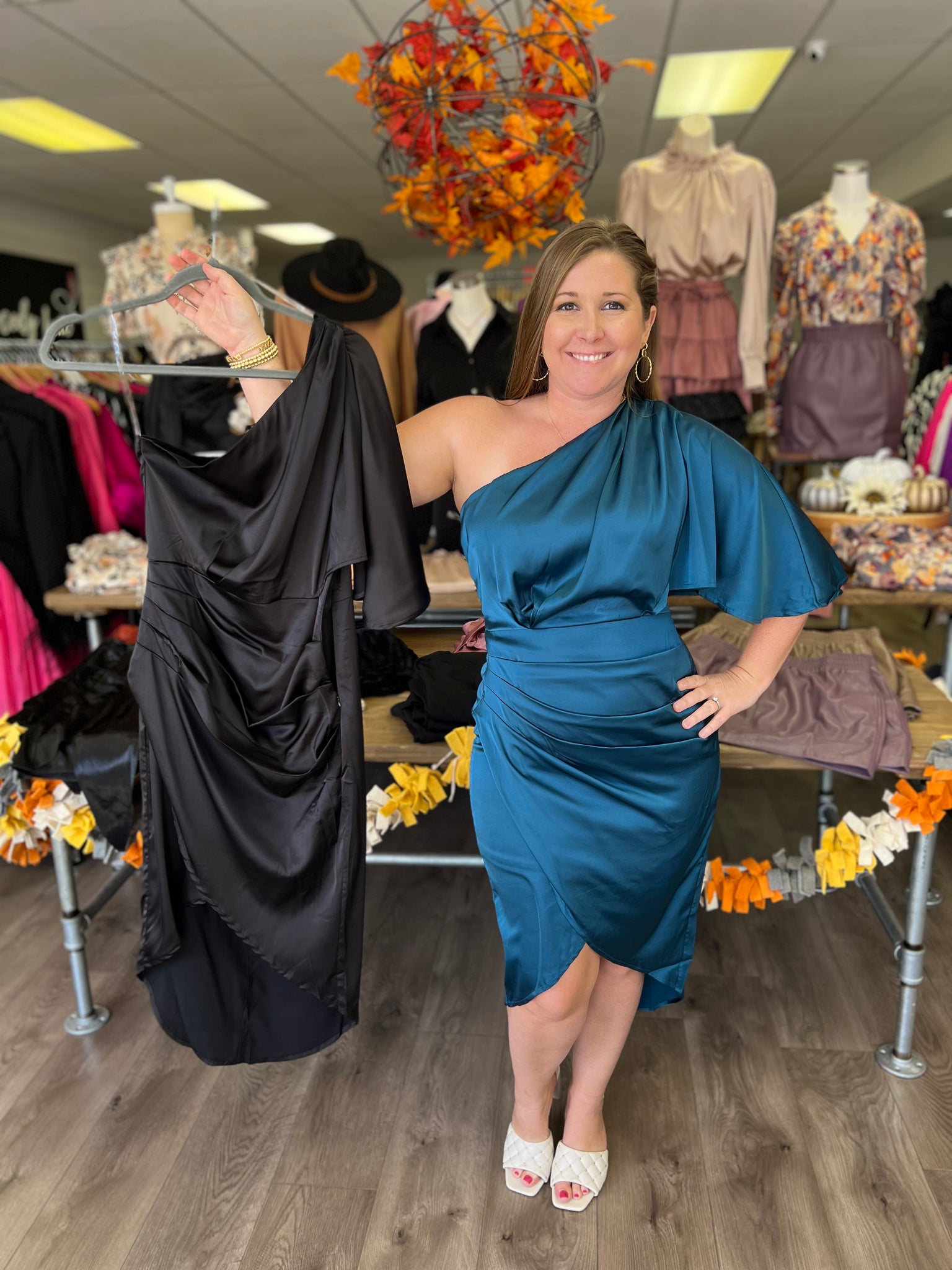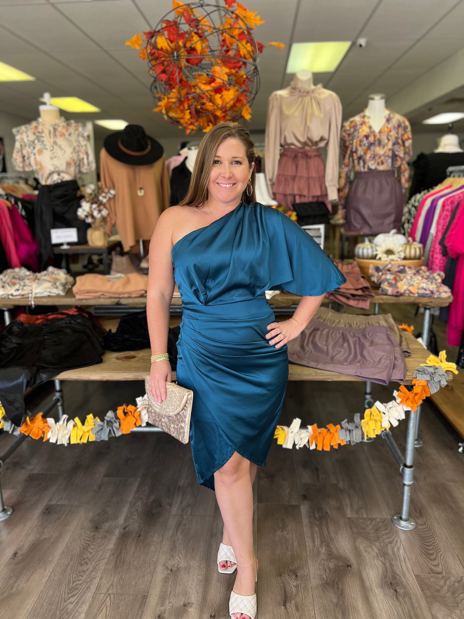 D10251 One shoulder satin dress with pleated bodice and flutter sleeves