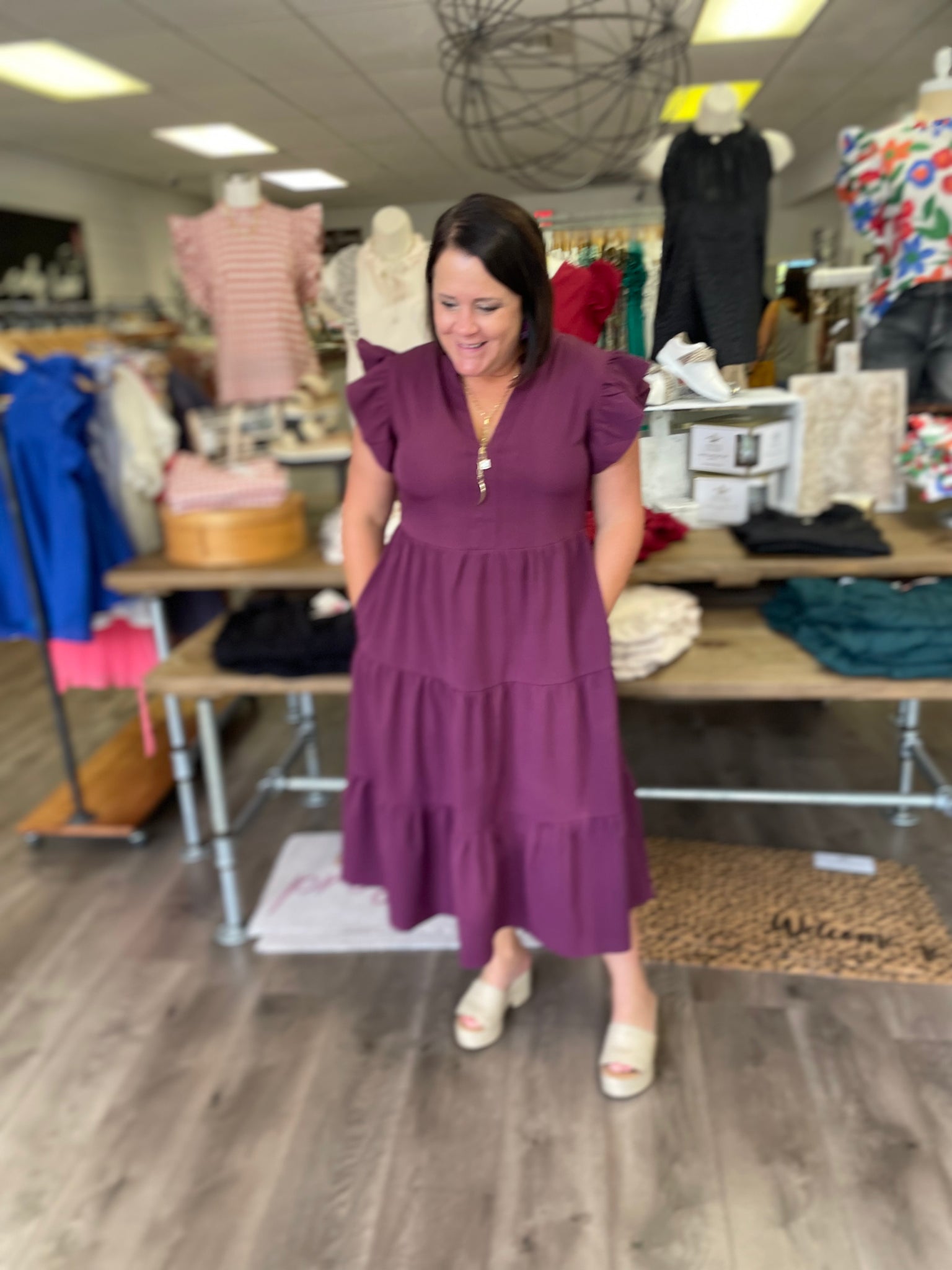 D18817 V-neck short sleeve tiered midi dress