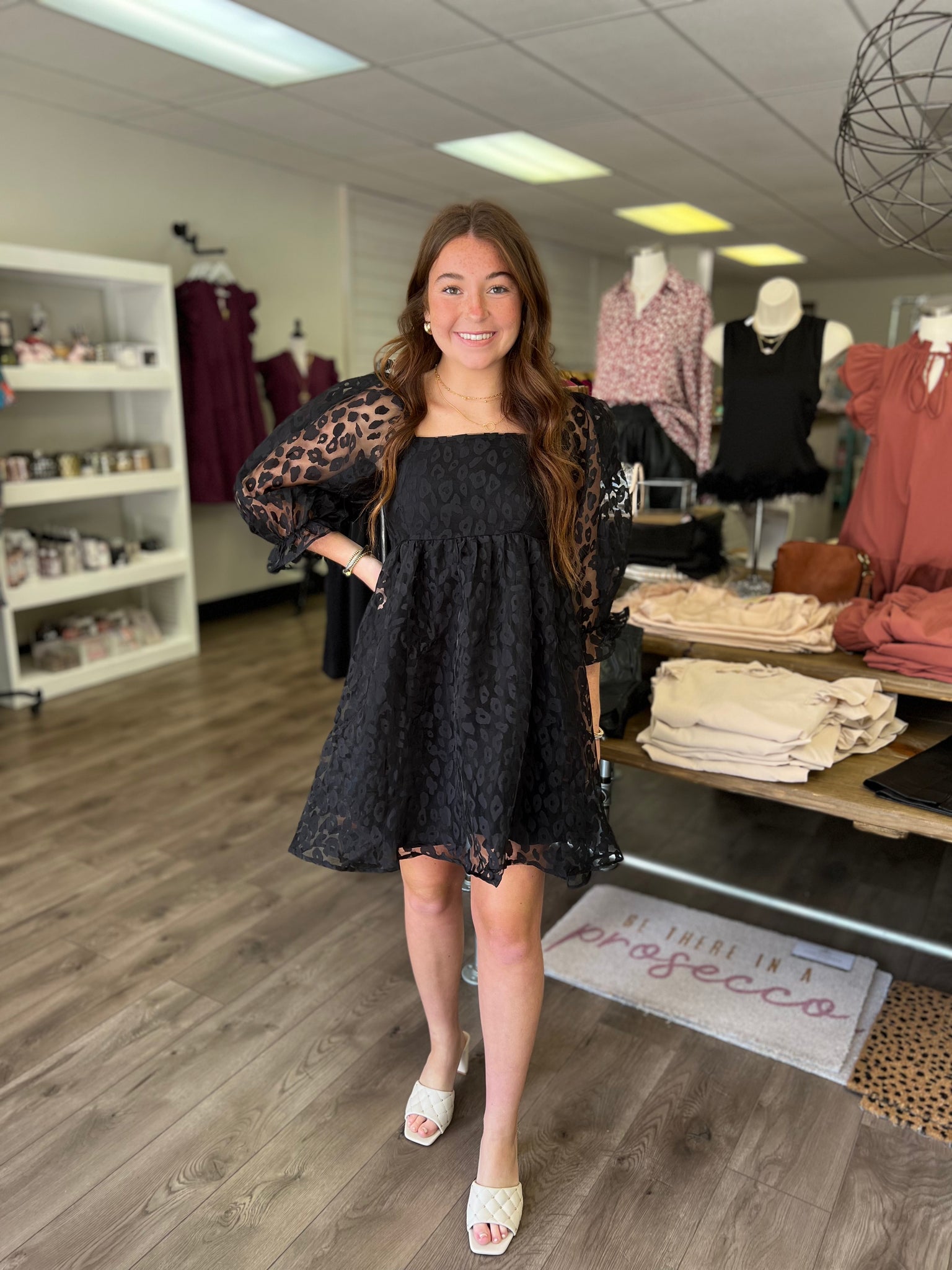 D18981 Animal print square neck 3/4 sleeve mini dress featuring ruffle detail at sleeves