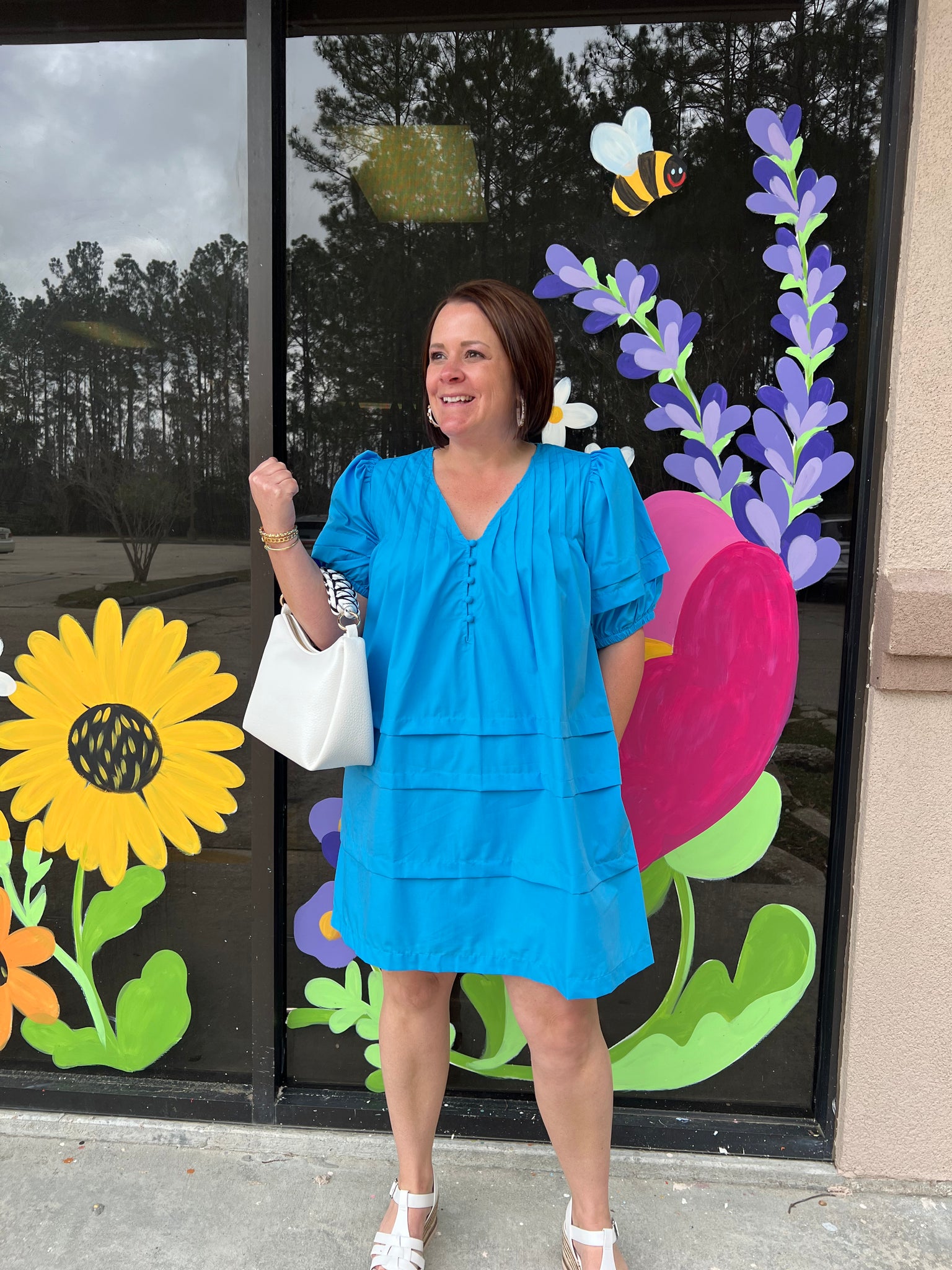 D22910 Solid v-neck puff sleeve mini dress featuring pleat detail. Button detail at front.