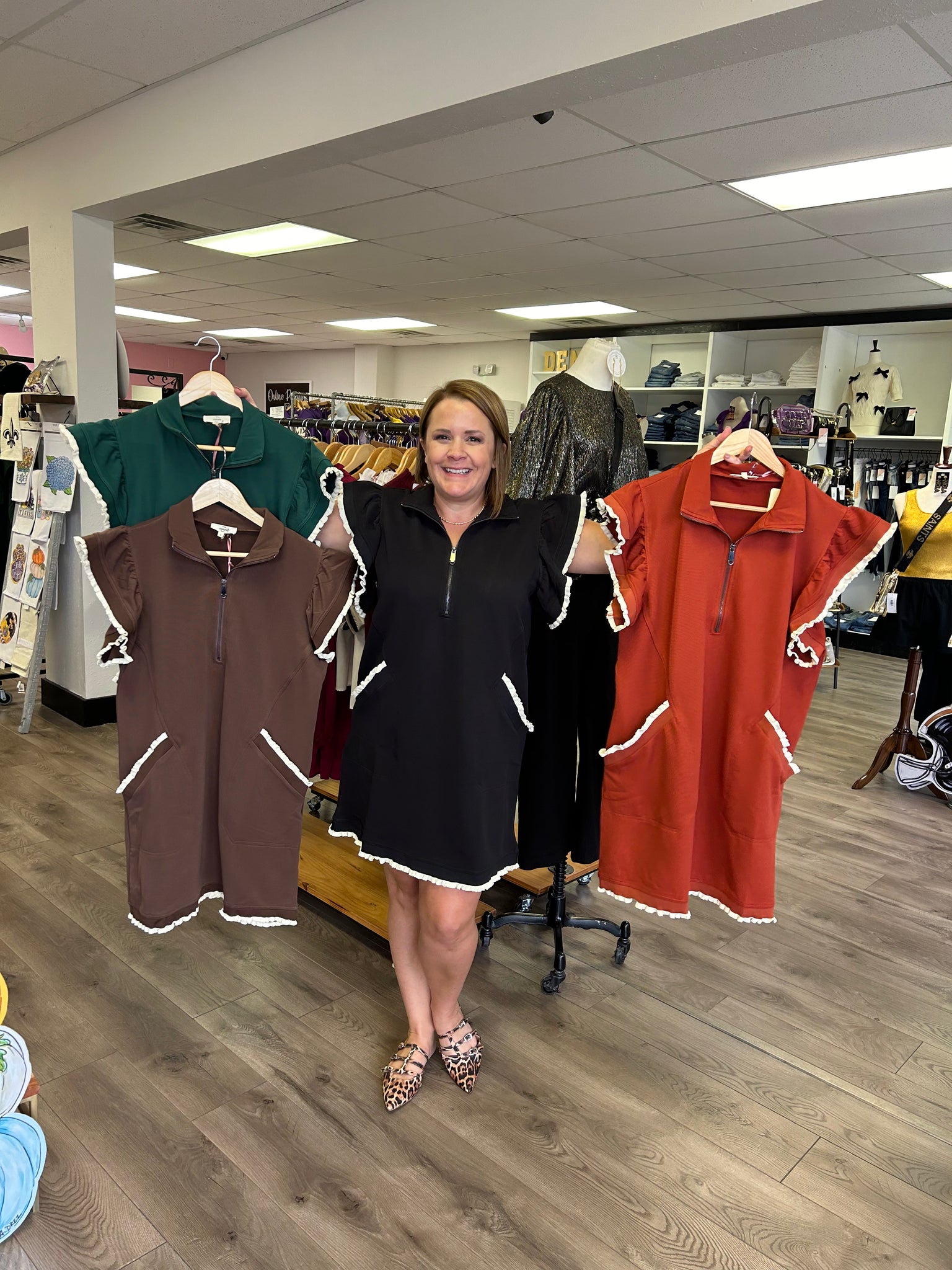 D24207 Solid half zip collared ruffle sleeve mini dress featuring contrasting trim
