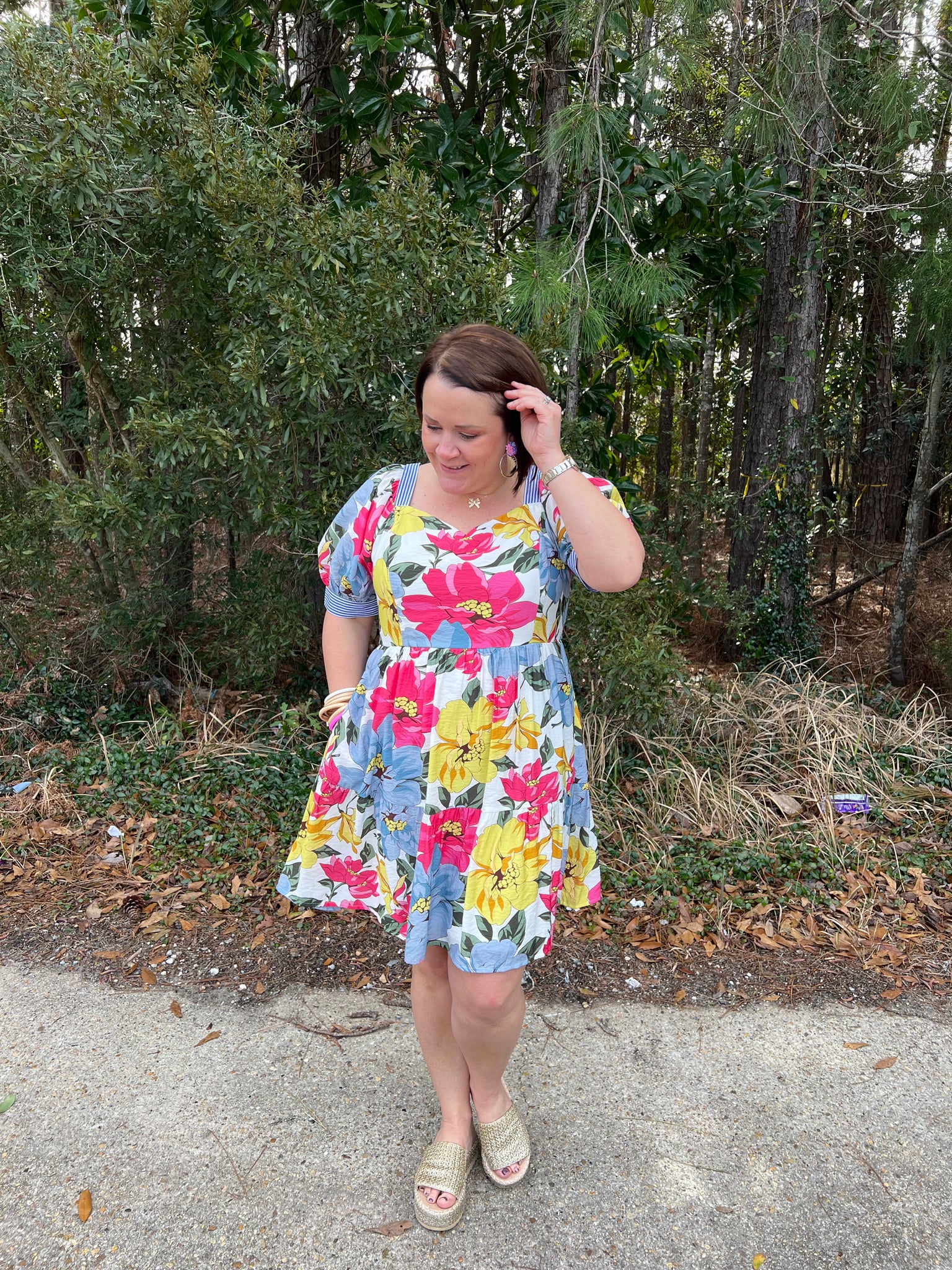 Floral print dress with sweetheart neck, back wrinkle detail, side pockets, short bubble sleeves, ruffled hemline, and striped trim. - Unlined, non-sheer, lightweight.