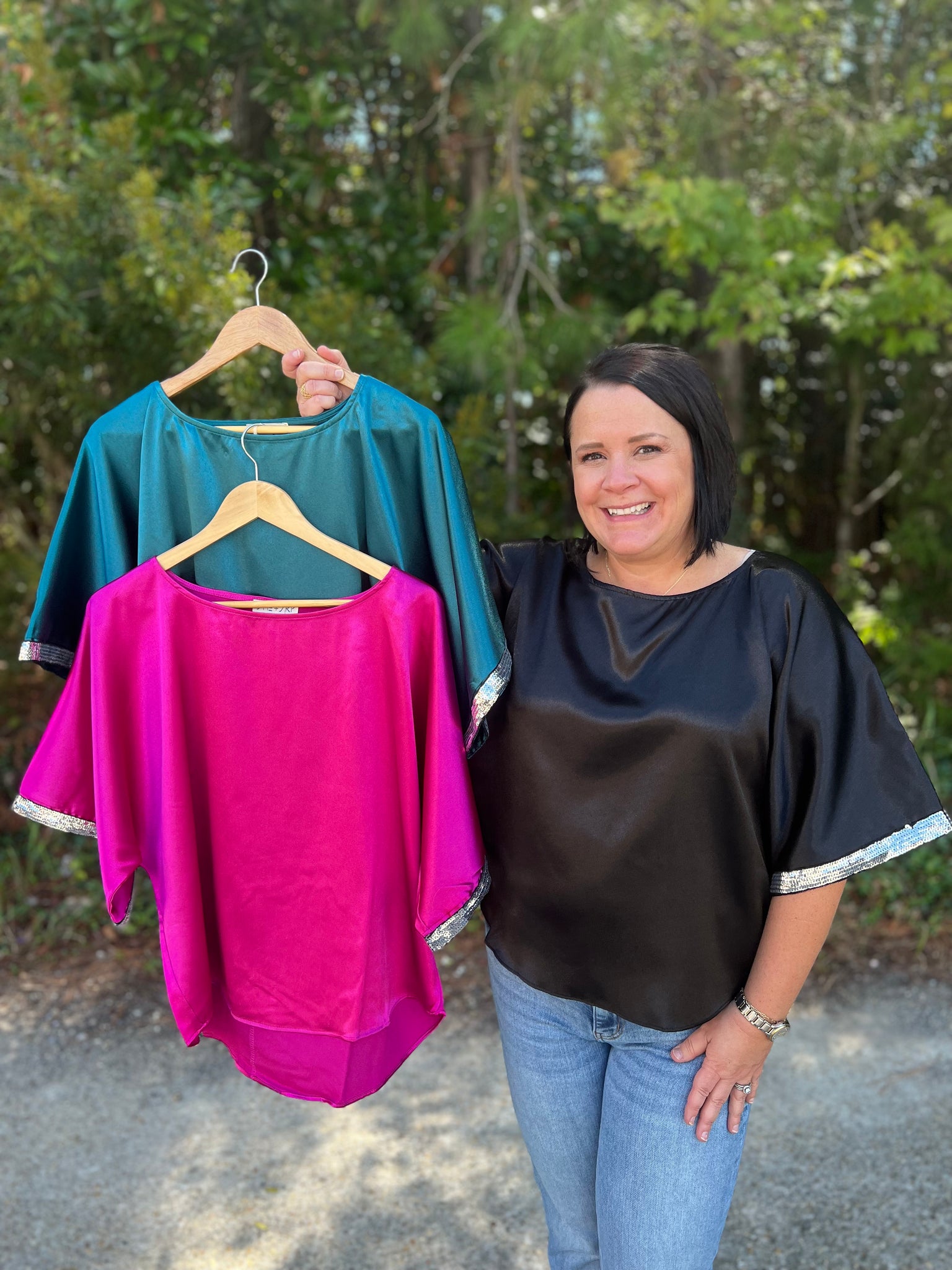SY5470 SEQUIN TRIM WOVEN TOP WITH KIMONO STYLE-SLEEVE