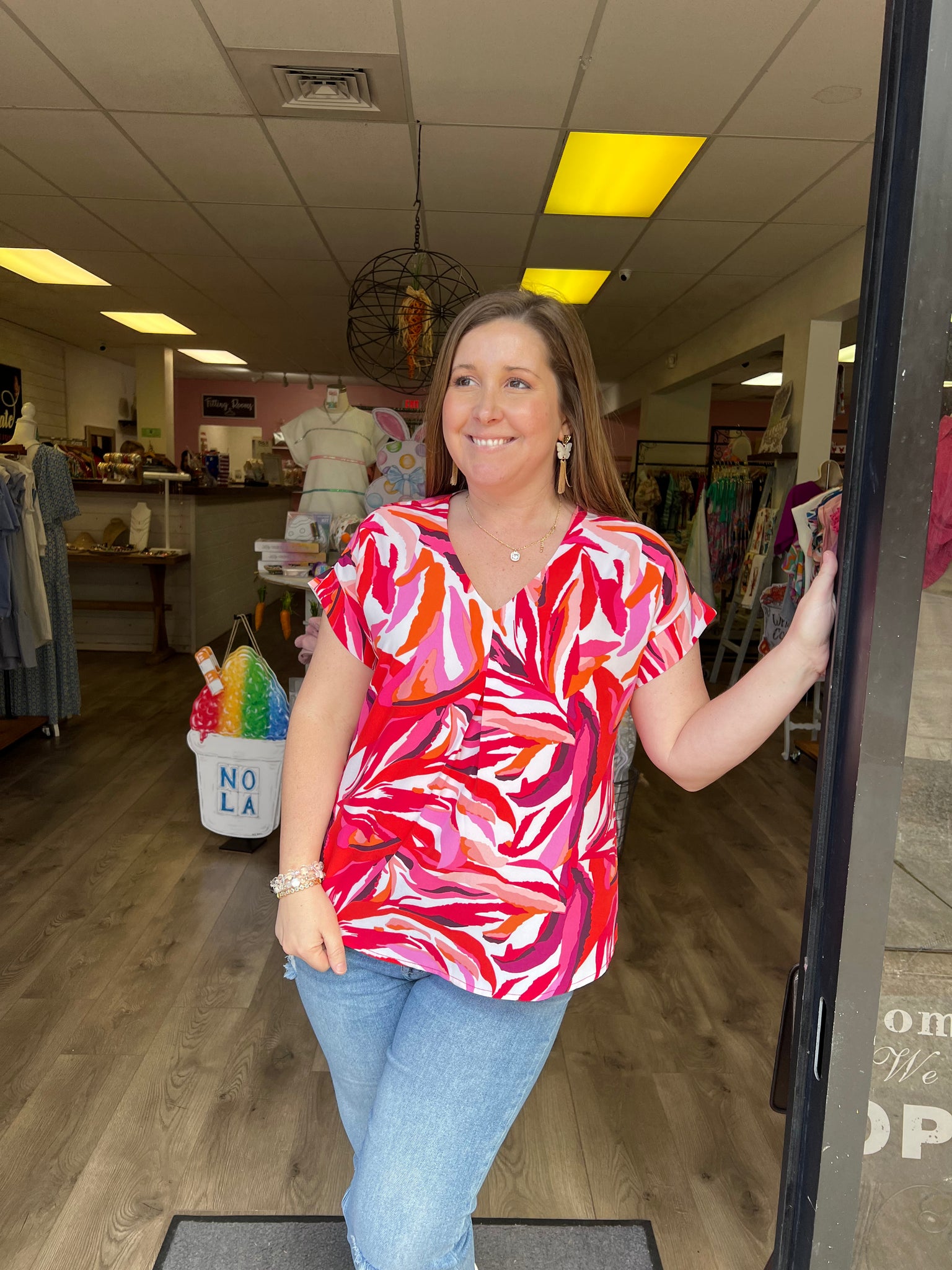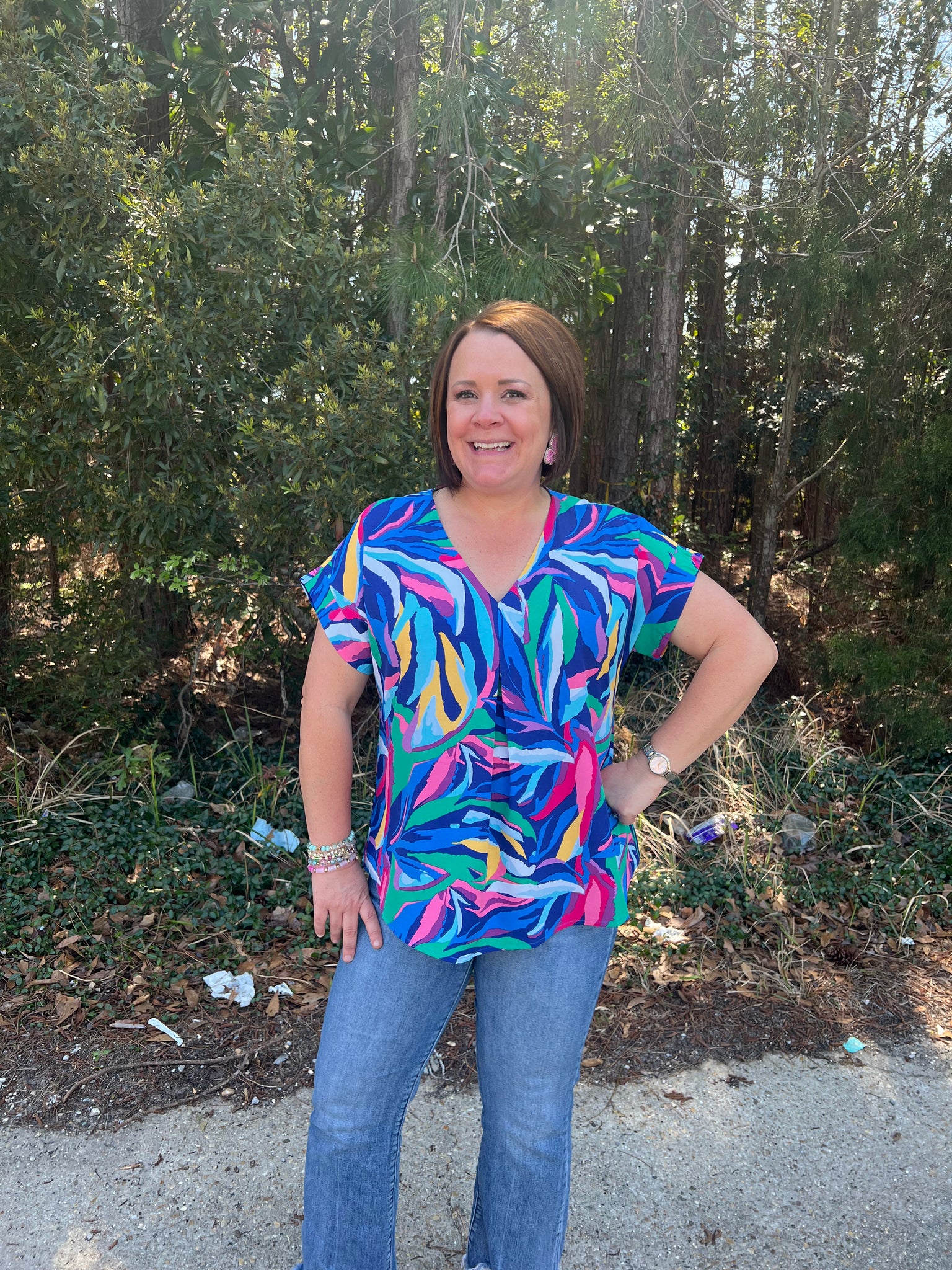 SY6469 Drop Shoulder v neck print woven top