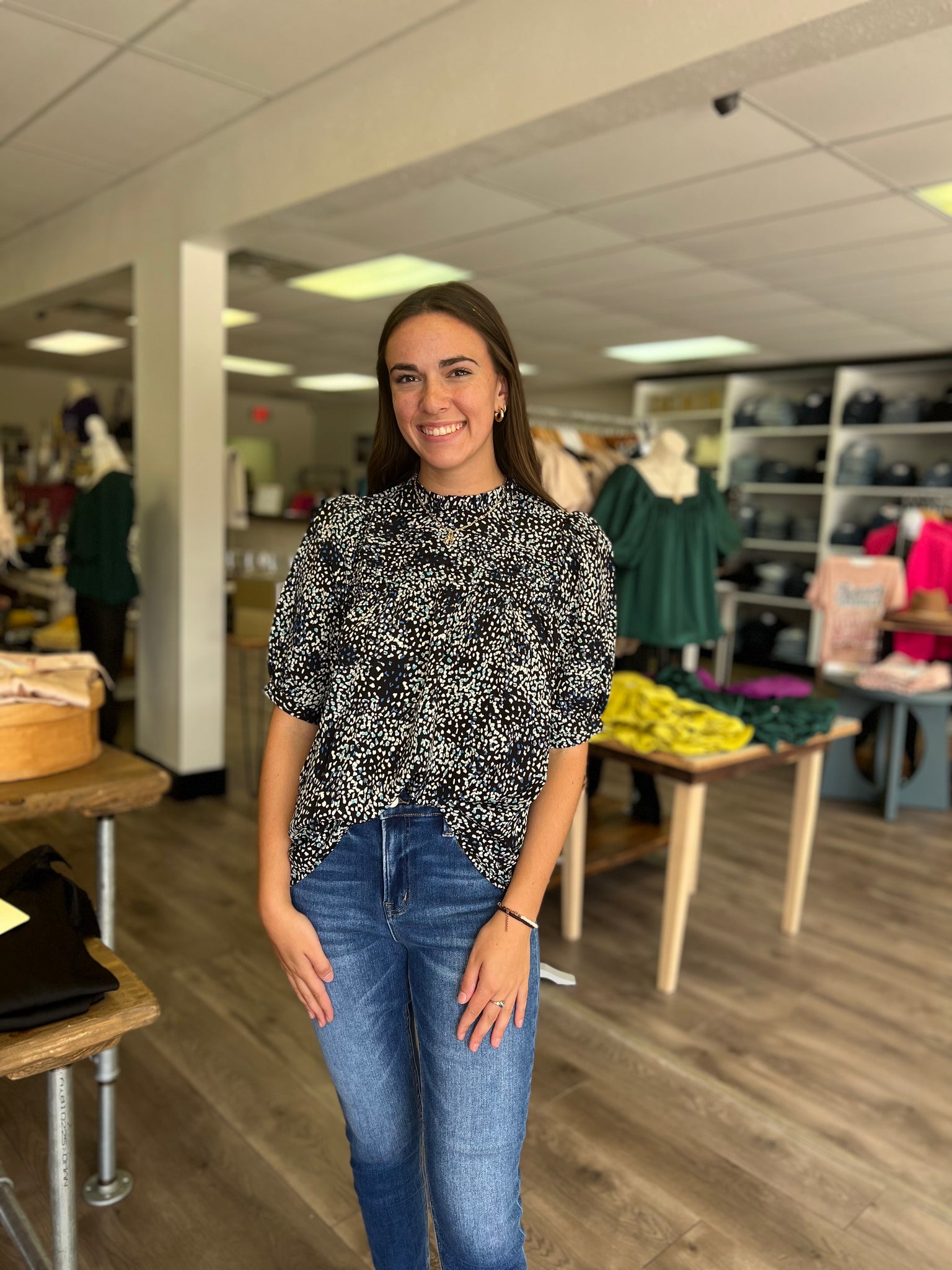 T18873 Print mock neck 3/4 sleeve top featuring pintuck detailing at front