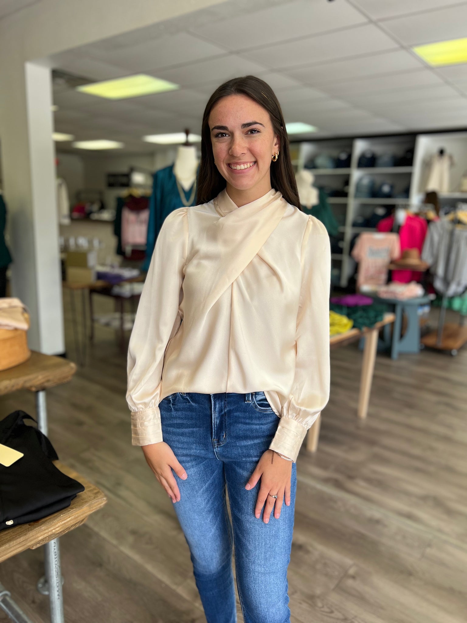 T19006 Satin cross front neck long sleeve top featuring self tie at back neck.