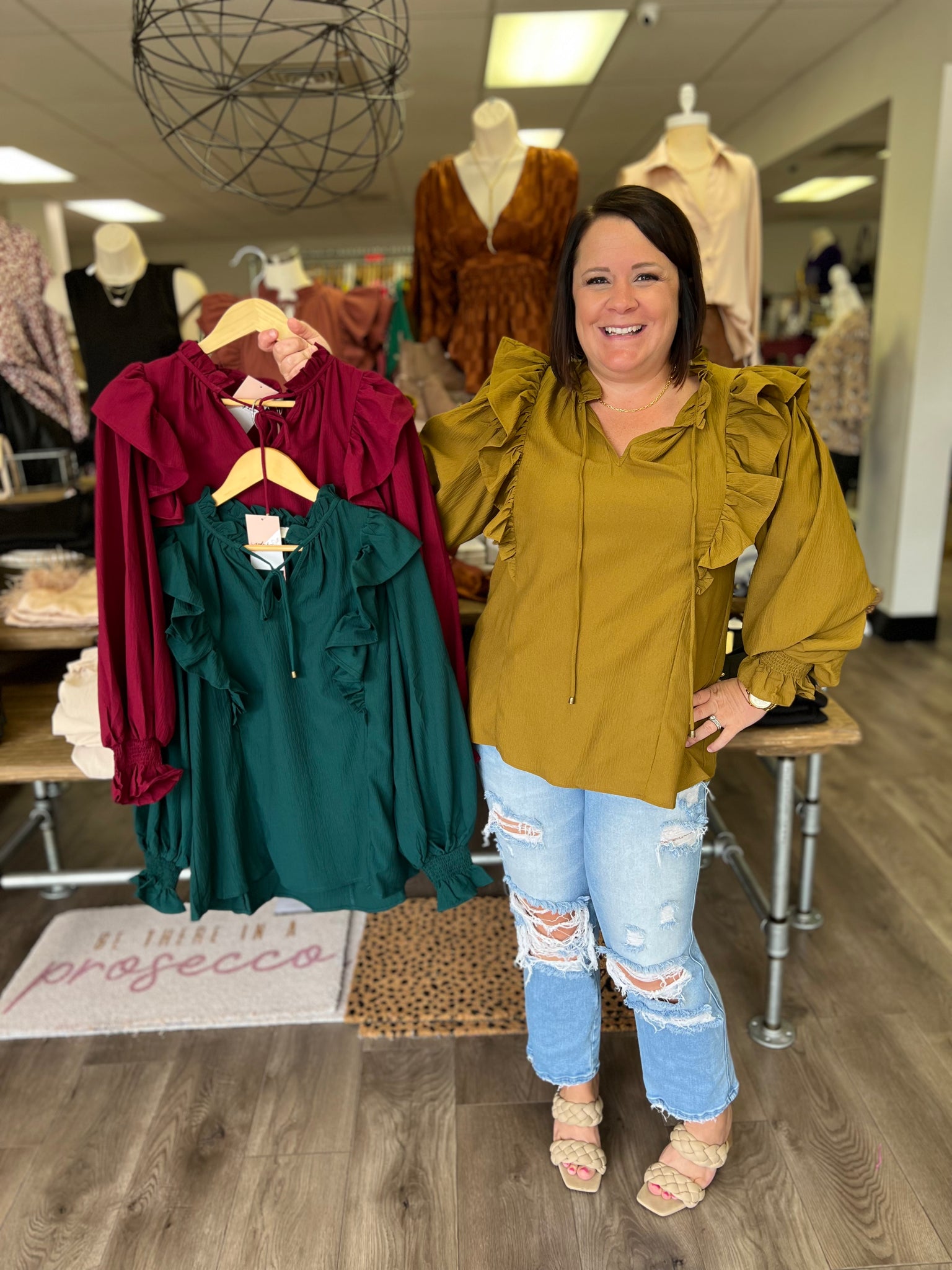 T19069 Textured v-neck long sleeve top featuring ruffle detailing at sleeve