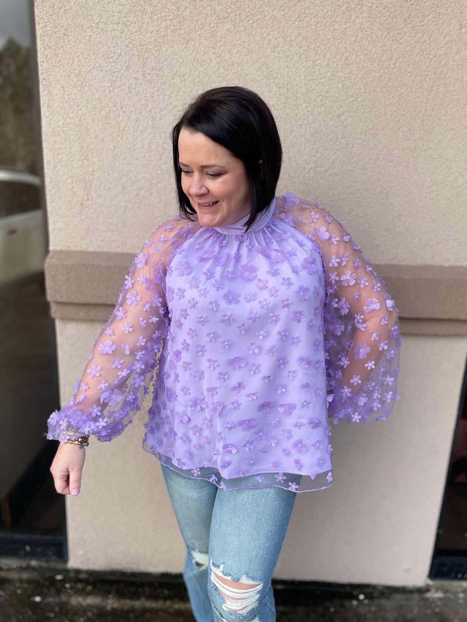 T19796 Mock neck long sleeve organza top featuring 3d flower details