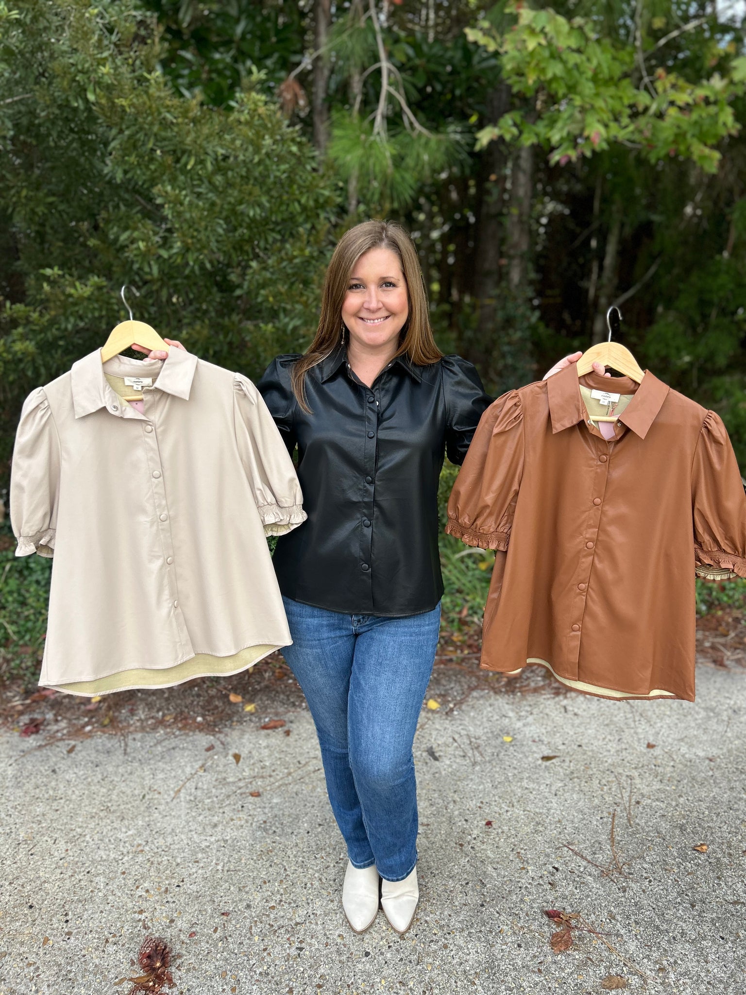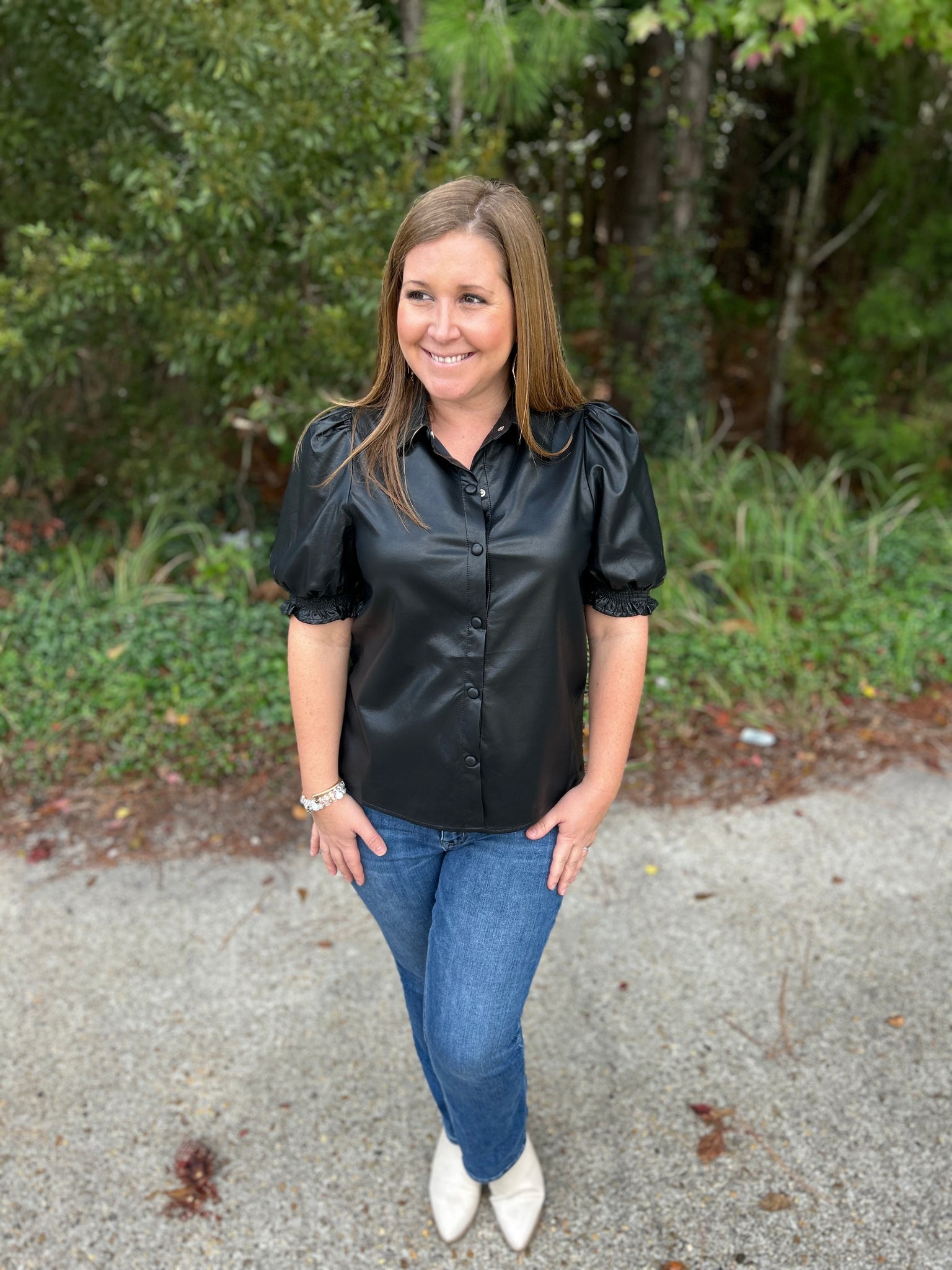 T21931 Faux leather collared short sleeve top featuring puff sleeve. Button-down closure.