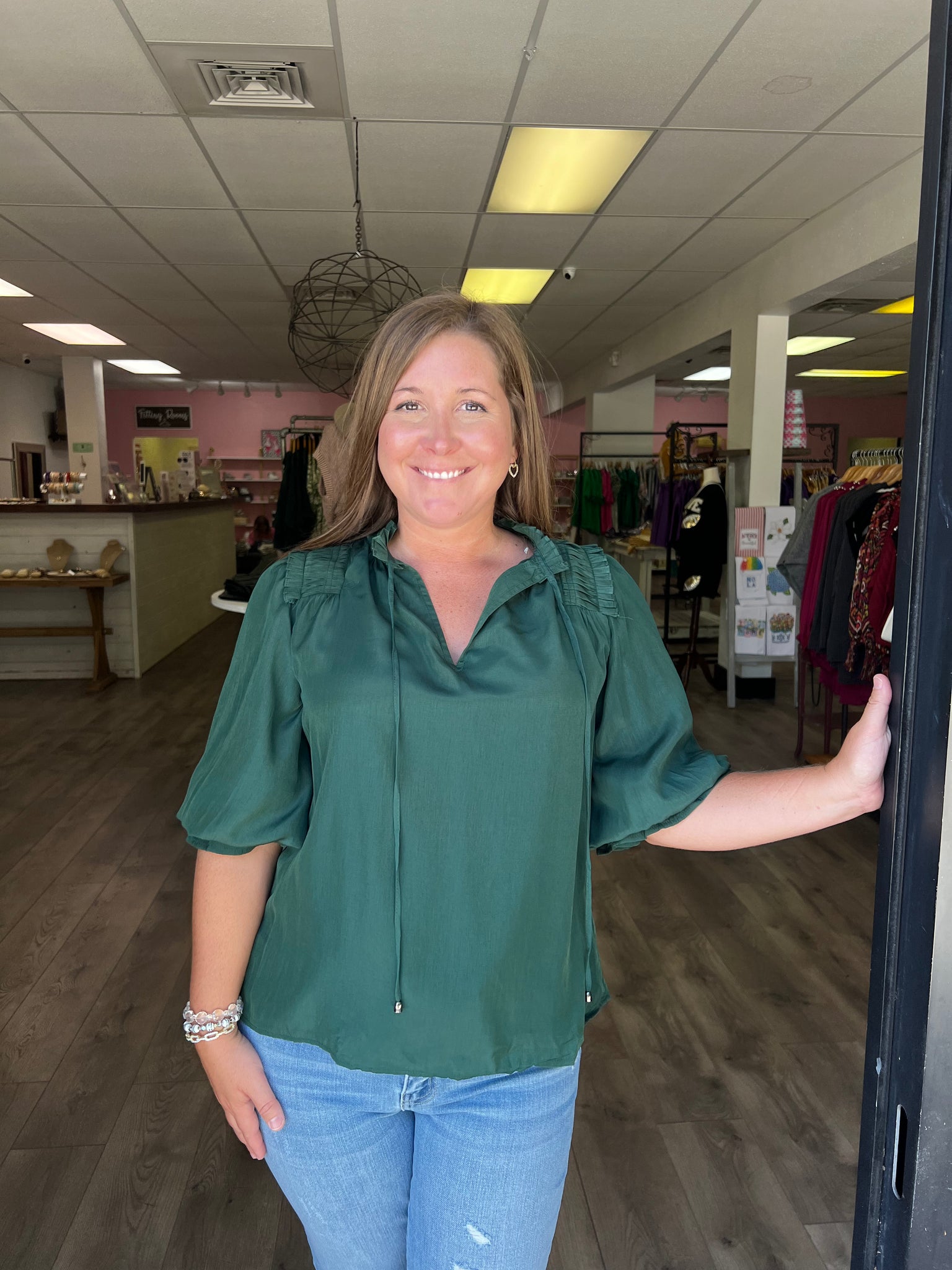 T24539 Solid half sleeve v-neck top featuring ruffled neckline